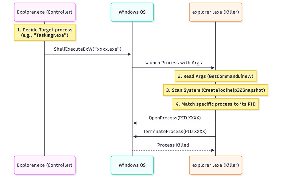 - Process killing: It terminates these processes using the TerminateProcess API to release their file locks.