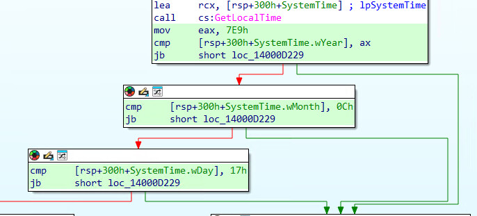 A significant discovery within the sub_14000D180 function is a hardcoded temporal check, serving as a "kill switch" or "time bomb." This mechanism operates by retrieving the local system time and comparing it against a predetermined deadline: December 23, 2025.