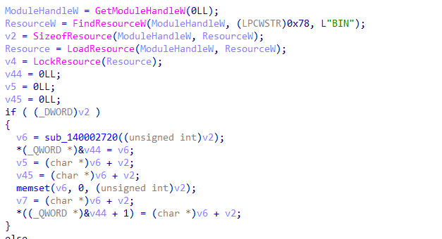 The payload is stored within the binary PE Resource Section under the ID BIN (Resource ID 120). The malware uses the standard Windows APIs FindResourceW, LoadResource, and LockResource to access this data blob in memory.