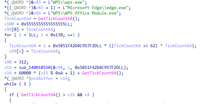 The loop uses GetTickCount64 (which retrieves the number of milliseconds since the system started) to seed a custom random number generator. Based on this timer, the malware randomly launches one of its Keepers: