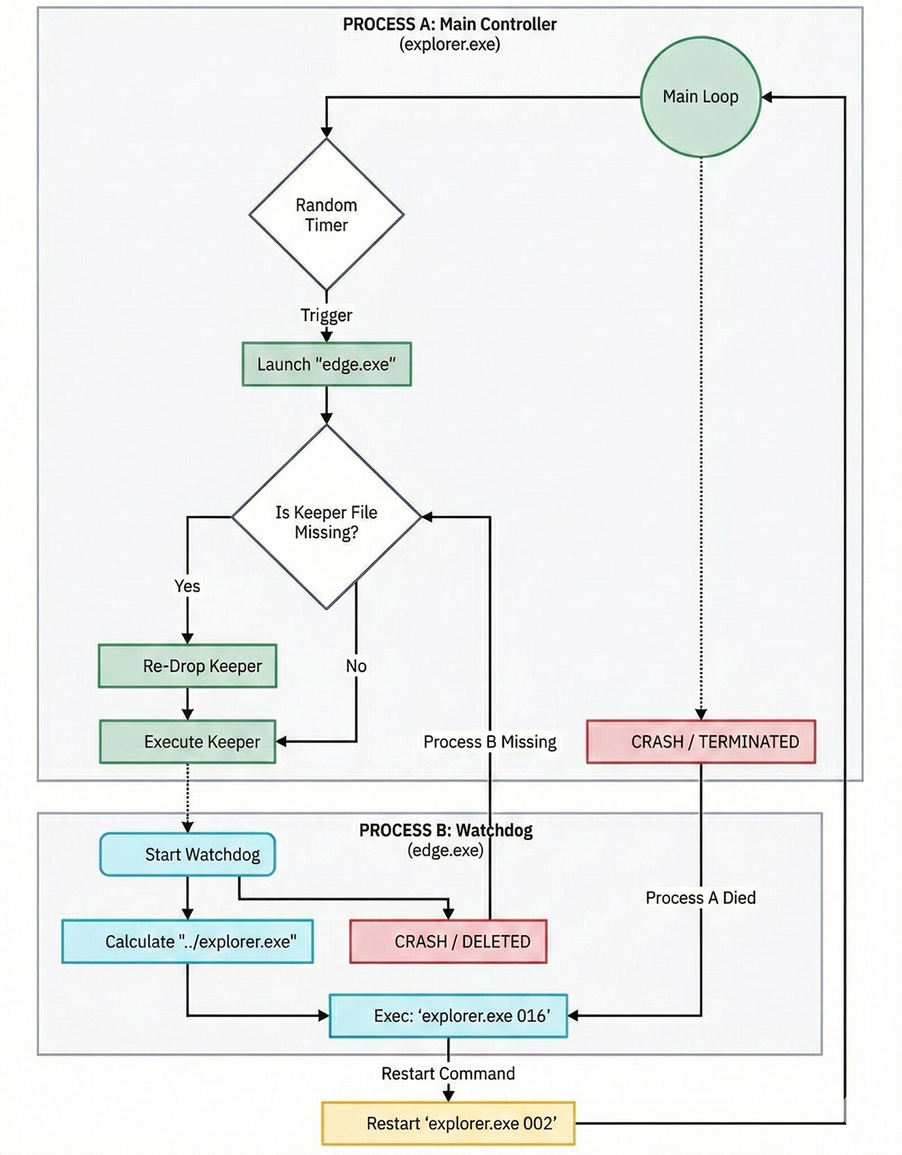 - Scenario B (keeper death): If the user deletes or kills edge.exe, Explorer.exe (which is running independently in its loop) will simply re-launch or re-drop it during its next loop iteration.