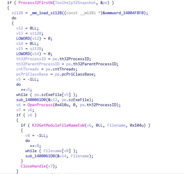 - Snapshot & hunt: It calls the Process Scanner (sub_14000B700) to generate a dynamic list of all running processes on the host.
