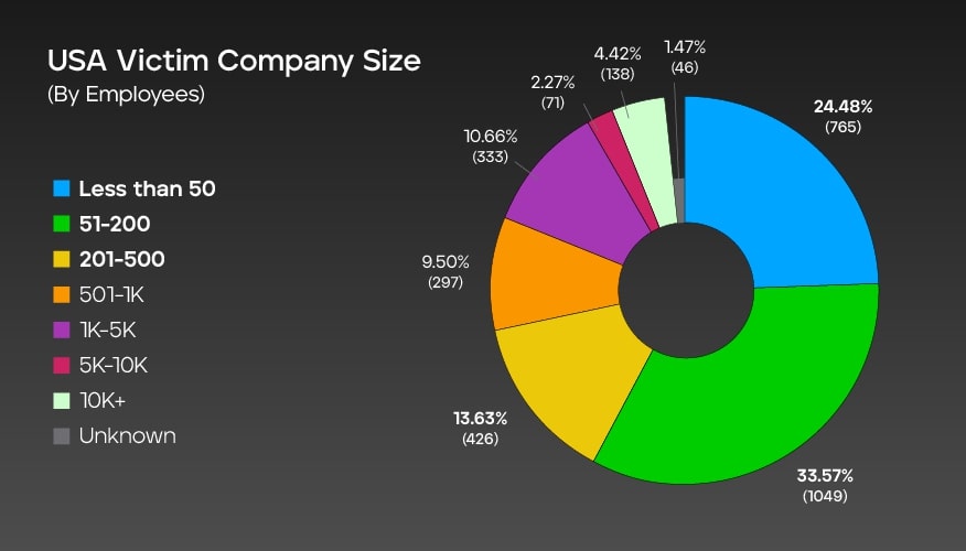 米国におけるランサムウェア攻撃の文脈で、従業員数で測定した被害企業の規模に基づく分布をグラフに示します。このグラフから、被害企業の大半(33.57%)は従業員数51~200人の企業であることがわかります。
