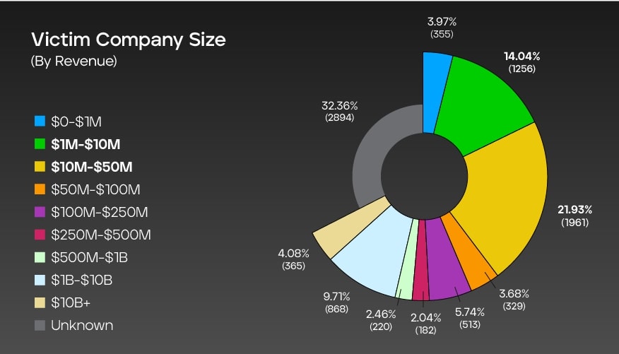 さらに、「不明」と表示されたカテゴリーがあり、全体の27.87%を占めており、一部の被害者の企業規模が不明であることを示しています。このデータで考慮されているランサムウェア被害者の総数は8,943人です。
