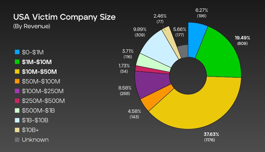 当社の分析により、ランサムウェアの被害者層におけるいくつかの重要な傾向とパターンが明らかになりました。第一に、ランサムウェア攻撃は、世界的にさまざまな規模の組織に影響を及ぼす広範な脅威であり続けていることが明らかになりました。攻撃を受けるのは大規模な組織だけではありません。収集されたデータポイントに基づき、次のように結論付けられます。