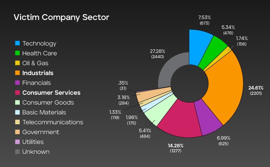 - 被害者は世界中にいたにもかかわらず、データセット内の被害組織のほとんどは米国にあり、主に消費者サービス、テクノロジー、金融、産業部門に属していた。