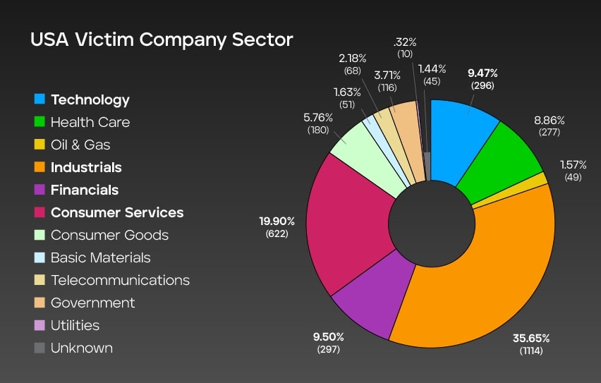 このグラフは、米国におけるランサムウェア攻撃の被害者を業種別に分類し、各業種で記録されたインシデントの件数と、合計3,125件のうち対応する割合の分布を示す、貴重な洞察を提供するものです。このデータでは、産業部門と消費者サービス部門に大きな影響があることが強調されており、それぞれインシデントの35.65%と19.90%を占めています。金融部門とテクノロジー部門が僅差で続き、インシデントの9.50%と9.47%を占め、ランサムウェア攻撃が様々な業界に広く及んでいることを示しています。
